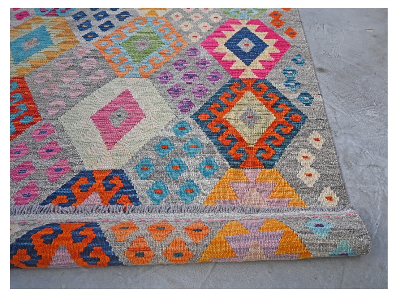 Inspired by old fashioned rugs, this collection, transform the kilim into an excellent decorative element. This kilim collection represents the modern day transformation of tradition. Traditional Afghan pattern reinvented with bright colors.