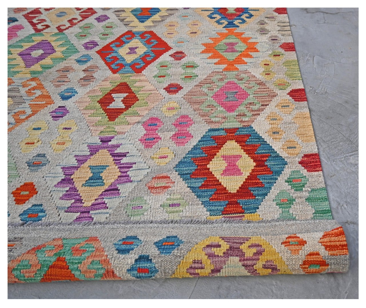 Inspired by old fashioned rugs, this collection, transform the kilim into an excellent decorative element. This kilim collection represents the modern day transformation of tradition. Traditional Afghan pattern reinvented with bright colors.