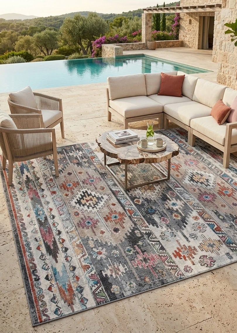 Indoor-outdoor carpet, interesting for the various shades of color that make it a timeless carpet and for its classic designs that refer to the Orient in a Vintage key.