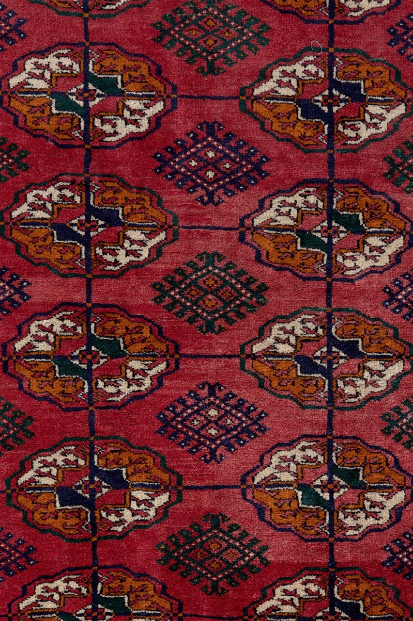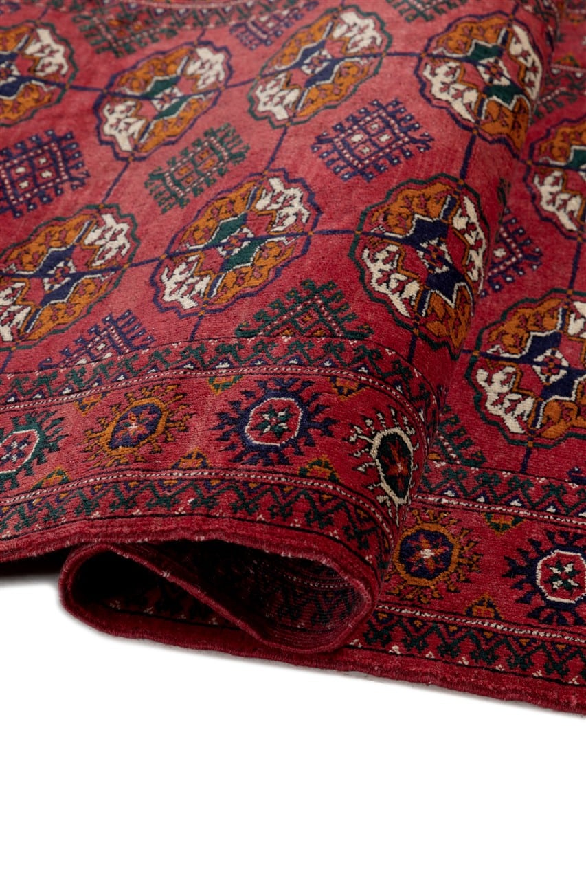 The Bukhara are among carpets the most popular and well known all over the world. Their classic design based on repeating patterns ”gul” arranged evenly over the entire field and enclosed by a frame full of minutely decorated borders, is a wonderful example of balance and harmony of shapes and decorations.